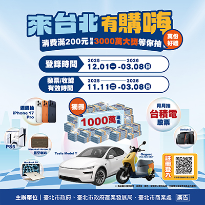 萬元入袋,準備好放大你的幸福感了嗎? 現在到台北消費,不只能吃好、玩好、住好,還能把這筆錢變成更大的驚喜。 從114年11月11日起至明(115)年3月8日,只要在臺北市店家單筆消費滿200元,至活動官網登錄發票或收據,即可獲得抽獎機會,至友好特店消費抽獎機會還可再加倍,1,000萬現金大紅包、高檔電動汽車及iPhone17等總獎值超過3,000萬元的萬份好禮等你帶回家,消費越多、機會越多,要將每個人的「一萬元小確幸」放大成真正的「大幸運」!